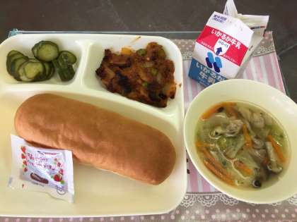 じゃがいものミートグラタン、スープ、きゅうりのピクルス、コッペパン、イチゴジャム、牛乳。