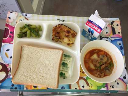 ケチャップ煮、グリーンアスパラガスのサラダ、りんごのクラフティ、