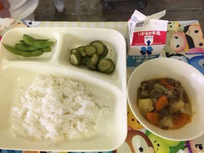 肉じゃが、きゅうりのかつお梅風味、枝豆、米飯、牛乳。