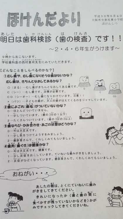 今日は「虫歯予防デー」です。明日は2・4・6年生の歯科検診があります。