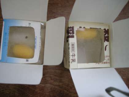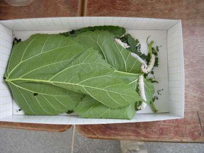 6月5日(火)カイコが食欲旺盛で、ムシャムシャ桑の葉を食べています。黄色いマユもあります。えさの加減で黄色い色がついたそうです。不思議ですね。