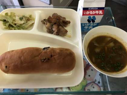 6月7日(木)鶏肉のガーリック焼き、ビーンズカレースープ、サワーソテー、パン、牛乳
