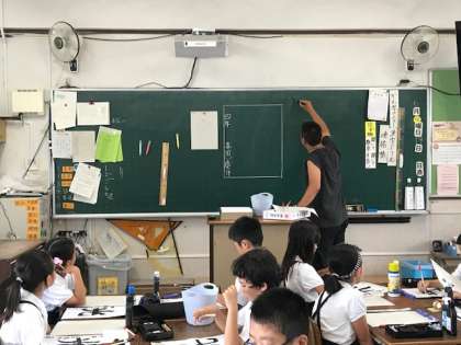 6月19日(火)5時間目、4年2組では書写をしていました。喜田先生が黒板で筆の使い方を話しているところです。この後、上手に書けたでしょうか?