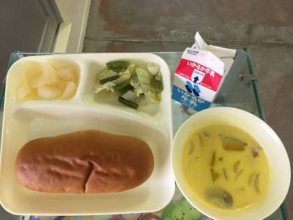 6月21日(木)かぼちゃのクリームシチュー、キャベツと三度豆のサラダ、和なし、パン、牛乳