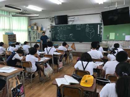 7月5日(木)2時間目、6年2組は算数で、角柱の体積の求め方を学習していました。途中2〜3人で話し合っている場面もあり、子ども達は真剣に考え意見を交換していました。