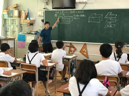 7月10日(火)2時間目、6年2組では算数を学習していました。「角柱を見つけて体積を求める」というめあてのもと、一見して底面積と高さのわからない立体の体積の求め方を考えていました。教育センターからお越しの先生に、子ども達が友達と相談したり、教え合ったりする姿と渡邊先生の指導の姿を見ていただき褒めていただきました。