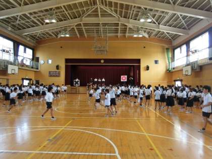 今日の集会はいろんな先生にまつわる○×クイズ。右に左に、たてわり班で相談して移動していました。せみ時雨がきこえてくる講堂で、正解するたびに子どもたちから歓声がおこっていました。