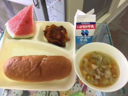 7月12日(木)かぼちゃのミートグラタン、スープ、すいか、パン、牛乳