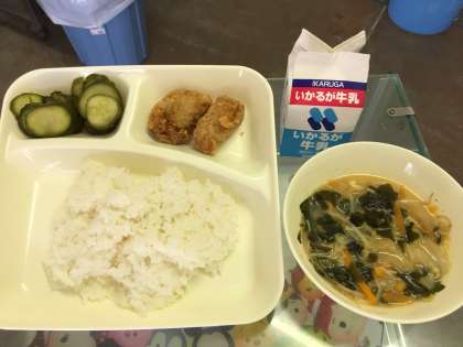 豚肉の香味あげ、みそ汁、きゅうりの甘酢づけ、米飯、牛乳。