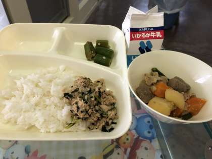 豚肉とじゃがいもの煮もの、オクラの梅風味、ツナっ葉いため、米飯、牛乳。