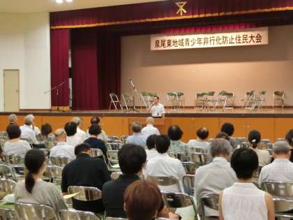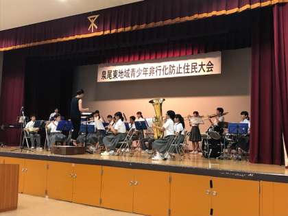大正北中学校吹奏楽部によるオープニングセレモニーのあと、大正警察からの非行化防止のポイントのお話がありました。そして、大正北中学校、泉尾東小学校それぞれから現況や夏休みに向けての話がありました。多くの方のご参加、ありがとうございました。