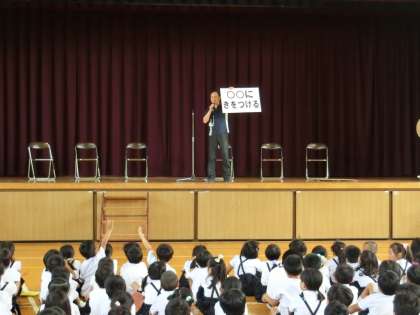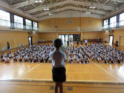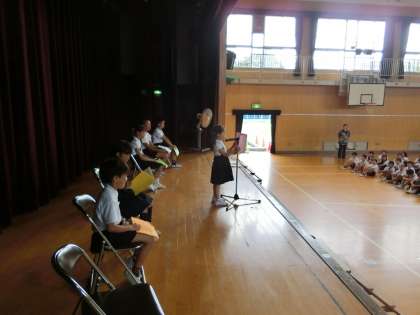 みんなで校歌を歌ったあと、各学年代表による作文発表では、1学期の思い出や夏休みに向けての話が多くありました。みんなしっかり話を聞いていました。