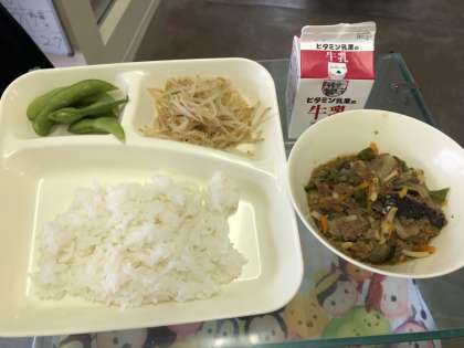 マーボーなす、もやしのごま酢あえ、枝豆、米飯、牛乳。