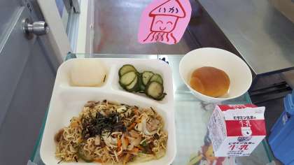 焼きそば、きゅうりの甘酢づけ、なし(二十世紀)、黒糖1/2パン、牛乳。