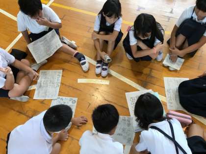 9月14日(金)今日は水曜日の朝と入れ替え児童集会がありました。今日の児童集会はいずひがカーニバルに向けて班での話し合いでした。班のめあてを決めた後、前半・後半を決めました。