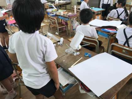 10月1日(月)5時間目、2年2組で、子ども達が楽しそうに何か作っていました。よくみるとおもちゃのようです。ペットボトルや空き箱等身の回りのいらない物を使って作っていました。写真はヨットカーで風で走る車のようです。友達の作っている様子もみながら、作っては遊び、遊んでは作りとみんな夢中になっていました。