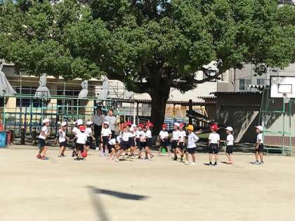 10月2日(火)2時間目、1年1組が運動場で体育をしていました。ドッジボールをしていました。まだ慣れていないのか、ごちゃごちゃと人が集まっている印象がありました。山崎先生から、「一回もボールを投げられなかった人はなぜだろう。」等と問いかけられながら楽しそうに動いていました。ボールを投げたり、受けたり、逃げたりする力が高まってくるとドッジボールらしくなってくるのでしょうね。
