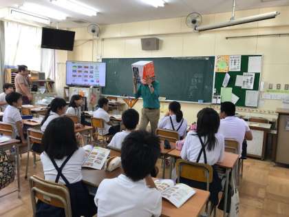 10月3日(水)4時間目、6年3組はC−NETのラファエル先生と英語を学習していました。ラファエル先生が目隠しをし、子ども達が「ターン、レフト」等方向を言って盛り上がっていました。
