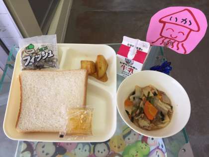 豚肉といかの中華煮、大学いも、ミニフィッシュ、食パン、マーマレードジャム、牛乳。さつまいもが甘くて「ホクホク」でした。