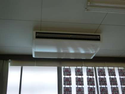 先週に引き続き、児童の登校しない土日は、空調機(エアコン)の設置工事が行われています。今日はコンクリートミキサー車が校庭に入りました。足場の設置も急ピッチです。教室には、エアコンの室内機が設置されました。しかし、電気配線やガス管の接続はまだまだですので、使える状態ではありません。教室の学習環境の整備が着々です。