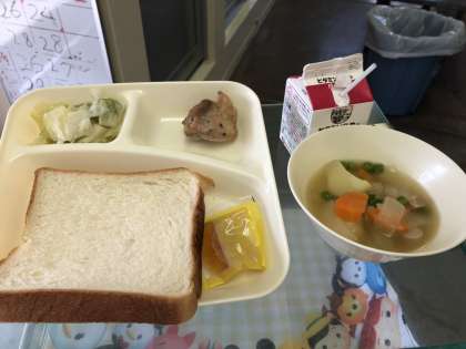 鶏肉の香草焼き、スープ煮、サワーキャベツ、食パン・アプリコットジャム、牛乳。