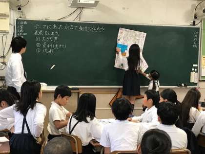 10月17日(水)3時間目、5年2組で、総合的な学習の時間の研究授業が行われました。大正区とつながりの深い沖縄県について子ども達は研究してきたことを発表していました。「沖縄のくらし」「沖縄の方言」「沖縄の産業と観光」の発表があり、クイズあり、劇ありでそれぞれ工夫していました。