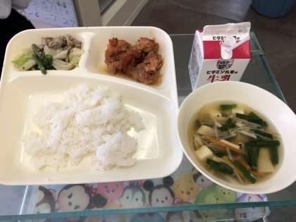 鶏肉のチリソース焼き、とうふとワンタンの皮のスープ、中華いため、米飯、牛乳。
