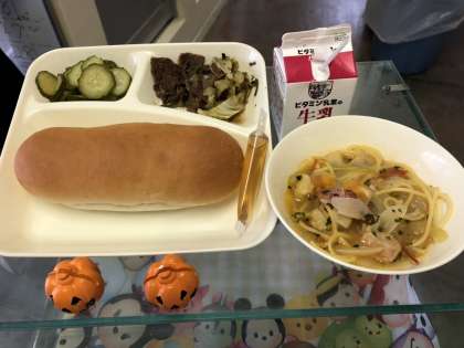 牛肉のカレー風味焼き、トマトのスープスパゲッティ、きゅうりのサラダ、コッペパン、はちみつ、牛乳。