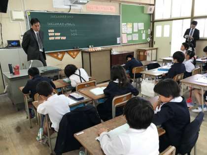 10月2日(金)5時間目、2年1組は算数の公開授業です。大正区内からも多くの先生方が見に来られました。3の段の九九を作るという授業でした。最初に片岡先生が3個パックのプリンを取り出すと、それだけで子ども達の学習に対する意欲はぐんとあがりました。算数の問題解決の流れをきちんと押さえたオーソドックスな授業で、子ども達はよく理解できているのかほぼ全員の手が挙がっていました。さすがベテランの授業という感じでした。