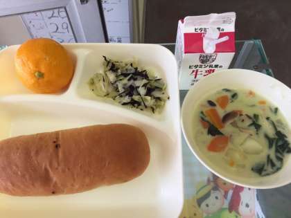 11月2日(金)きのこのクリームシチュー、キャベツのひじきドレッシング、みかん、パン、牛乳