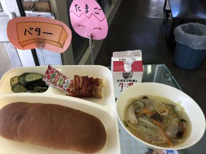 ツナポテトオムレツ、スープ、きゅうりのバジル風味サラダ、黒糖パン、牛乳。