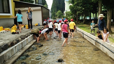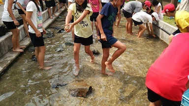 自然散策・写生と前後して、午前中のメインの活動は「魚つかみ」。水の中をすばしっこく動き回る川魚を手づかみで捕まえます。ヌルヌルした魚はつかみにくいのですが、子どもたちは何度も挑戦して捕えていました。魚の感触を体感したひと時でした。