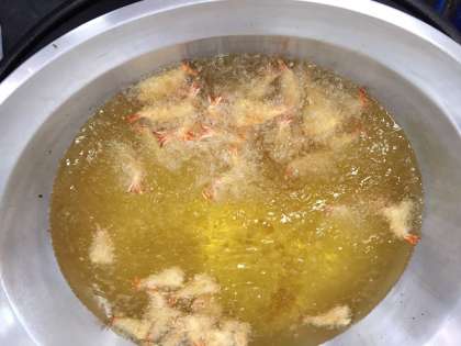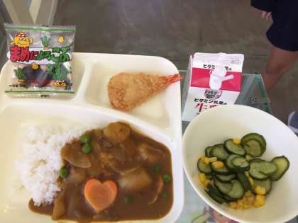 えびフライカレーライス、きゅうりとコーンのサラダ、豆こんぶ、牛乳。