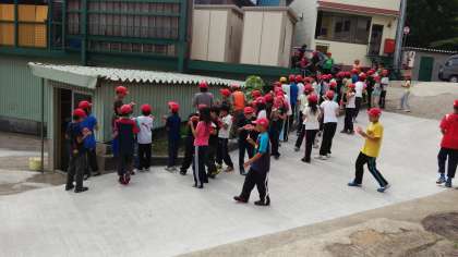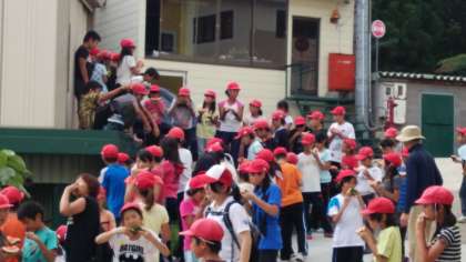 午後3時、おやつの時間です。今日のおやつはスイカ。炎天下で焼き板を磨く作業をしていたので、みんなとてもおいしそうに食べています。