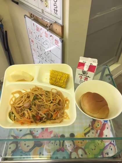 チキントマトスパゲッティ、焼きとうもろこし、りんご、黒糖パン、牛乳。