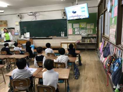 11月16日(金)朝のイングリッシュタイムの時間に1年1組から元気な声が聞こえてきました。ビデオに合わせてチャンツという発音の練習をしていました。