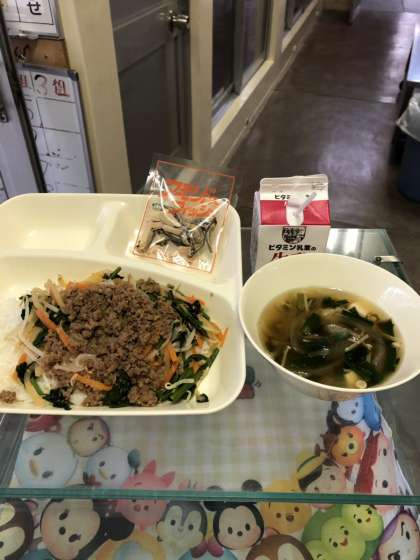 ビビンバ、わかめスープ、アーモンドフィッシュ、米飯、牛乳。