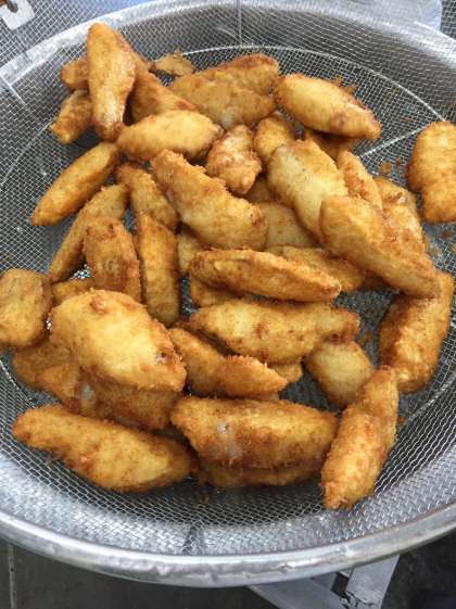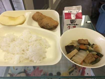 たらのフライ、あつあげと野菜の煮もの、りんご、米飯、牛乳。