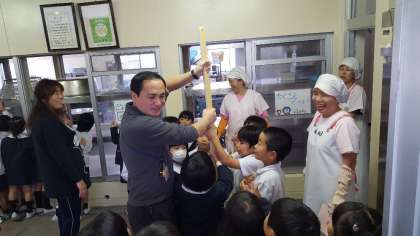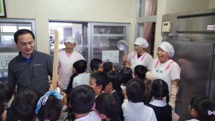 給食調理員さんから大きなしゃもじをさわらせてもらったり、大きなお鍋を見せてもらったりして大きな歓声をあげていました。家で使うお鍋がお汁をかきまぜるひしゃくのようになっていて、「大きなスプーンみたい」という声も聞かれました。