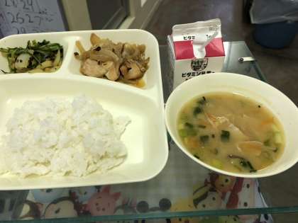 鶏肉の甘辛焼き、みそ汁、きくなとはくさいのごまあえ、米飯、牛乳。