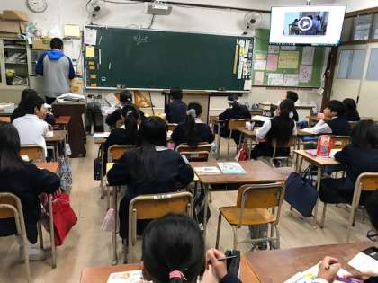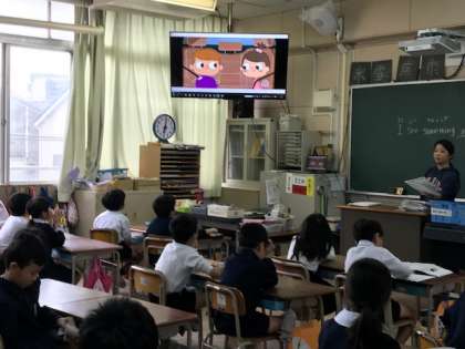 12月7日(金)校内を回っていますと2年2組から声が聞こえてきました。よく聞くと英語です。朝のイングリッシュタイムで「I see something (色).」をビデオを見ながら発声していました。次に4年2組では、「What time is it?」をビデオを見て、答えを教科書から探すということをしていました。