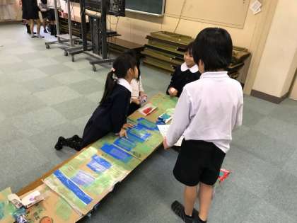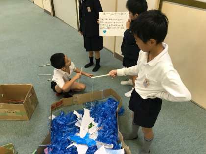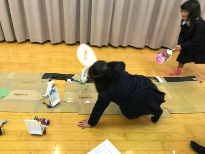 12月7日(金)1時間目、2年2組は「おもちゃランド」で遊んでいました。水曜日に1年生を招待し「おもちゃランド」を開いていましたので、もう終わりだと思っていました。聞いてみますと、お互いに遊んでいないものがあったようで、再度自分達で「おもちゃランド」を開催することになったようです。子ども達が自分たちで「こうしよう」と決め、満足いくまで追究することで、あらたな活動が生み出されてくるように感じました。自分で決め実現していく姿は、楽しさで満ち溢れていました。おもちゃも、どんどん改良されていて驚きました。