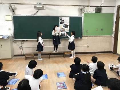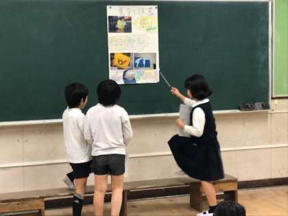 12月7日(金)6時間目、3年生は机、いすのなくなった教室で「総合」の発表をしていました。自分たちが地域で興味のあるところを探検して分かったことをポスターにして発表していました。
