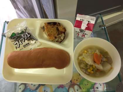 鶏肉とじゃがいものスープ煮、きのこのドリア、ミニフィッシュ、コッペパン、牛乳。