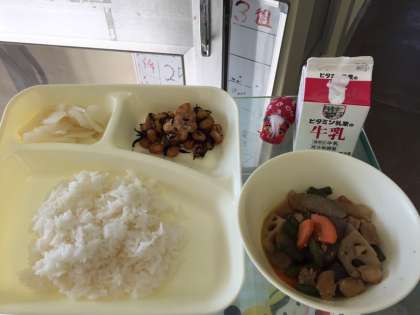 筑前煮、ひじき豆、だいこんのゆず風味、米飯、牛乳。