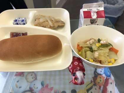 あじのレモンマリネ、スープ煮、固形チーズ、コッペパン、イチゴジャム、牛乳。