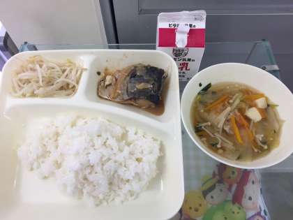 さばのみそ煮、五目汁、もやしの甘酢あえ、米飯、牛乳。