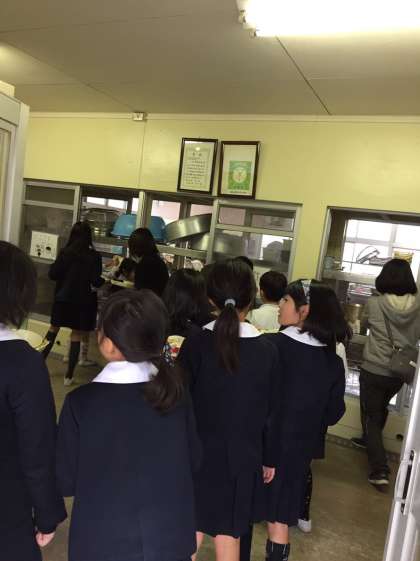 2枚目の写真は、さばの骨をとるのに苦労した子どもたちが、最後に骨を返しに来て並んでいるところです。『行列のできる給食室』となりました。