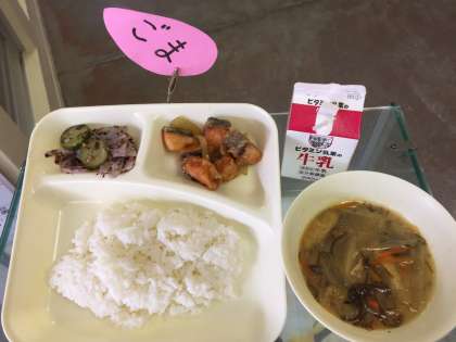 さけのなんばんづけ、もずくのおみそ汁、れんこんの赤じそあえ、米飯、牛乳。