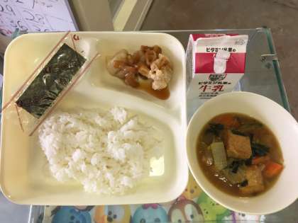あげ鶏のねぎソースかけ、あつあげとはくさいの中華煮、焼きのり、米飯、牛乳。